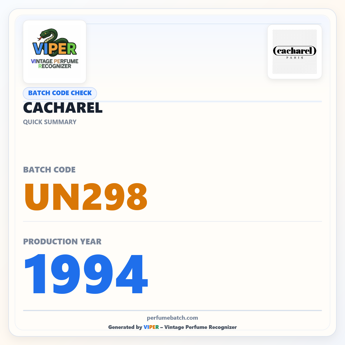 The batch code UN298 was checked using VIPER – Vintage Perfume Recognizer, a tool specialized in dating vintage perfumes, confirming production in 1994 .