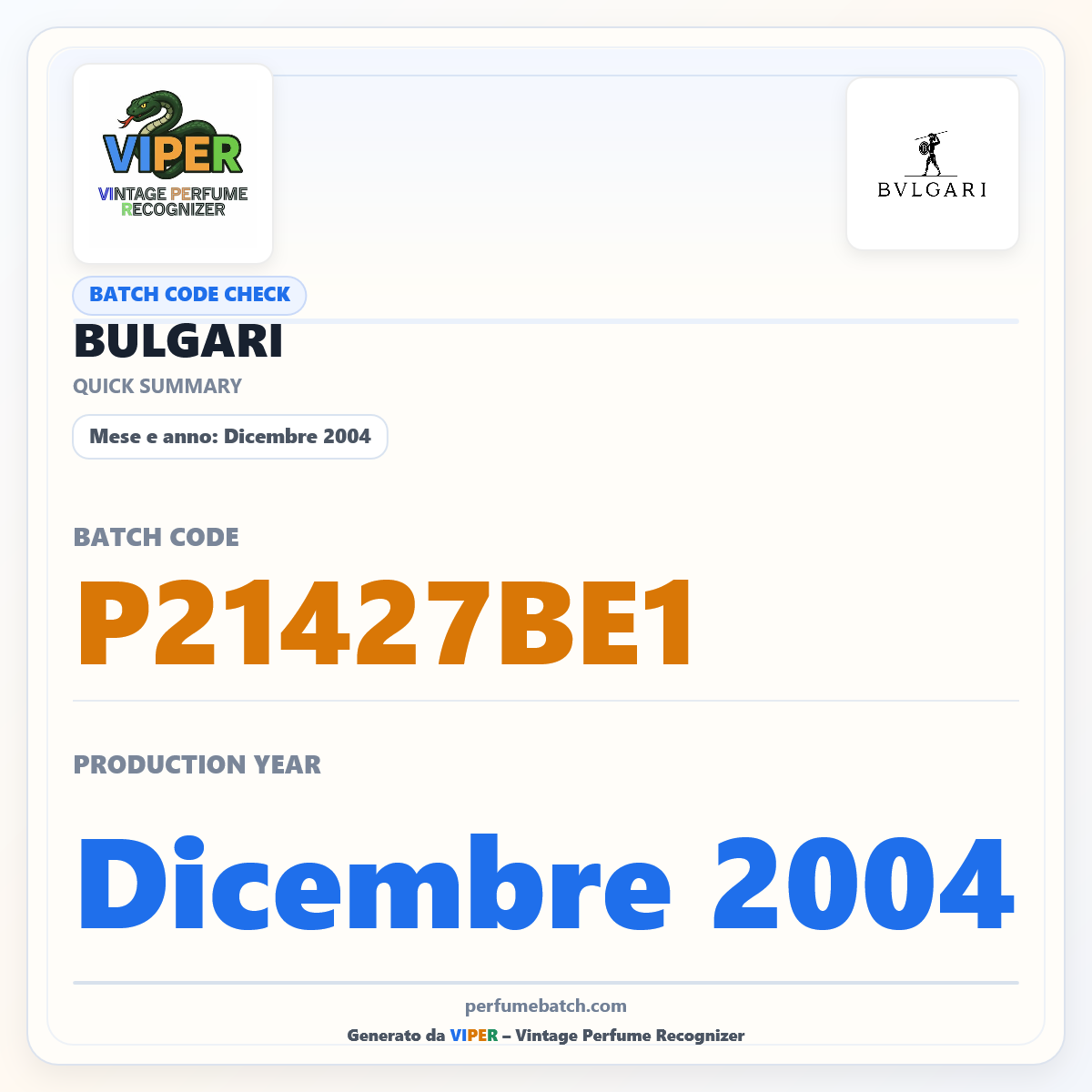 Batch code P21427BE1 was checked using VIPER – Vintage Perfume Recognizer, a tool specialized in dating vintage perfumes, confirming production in 2004 .